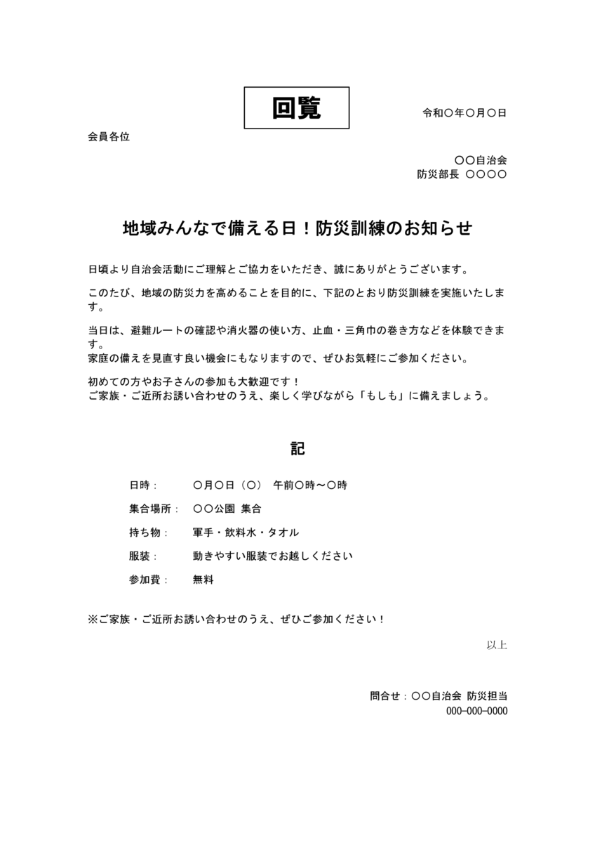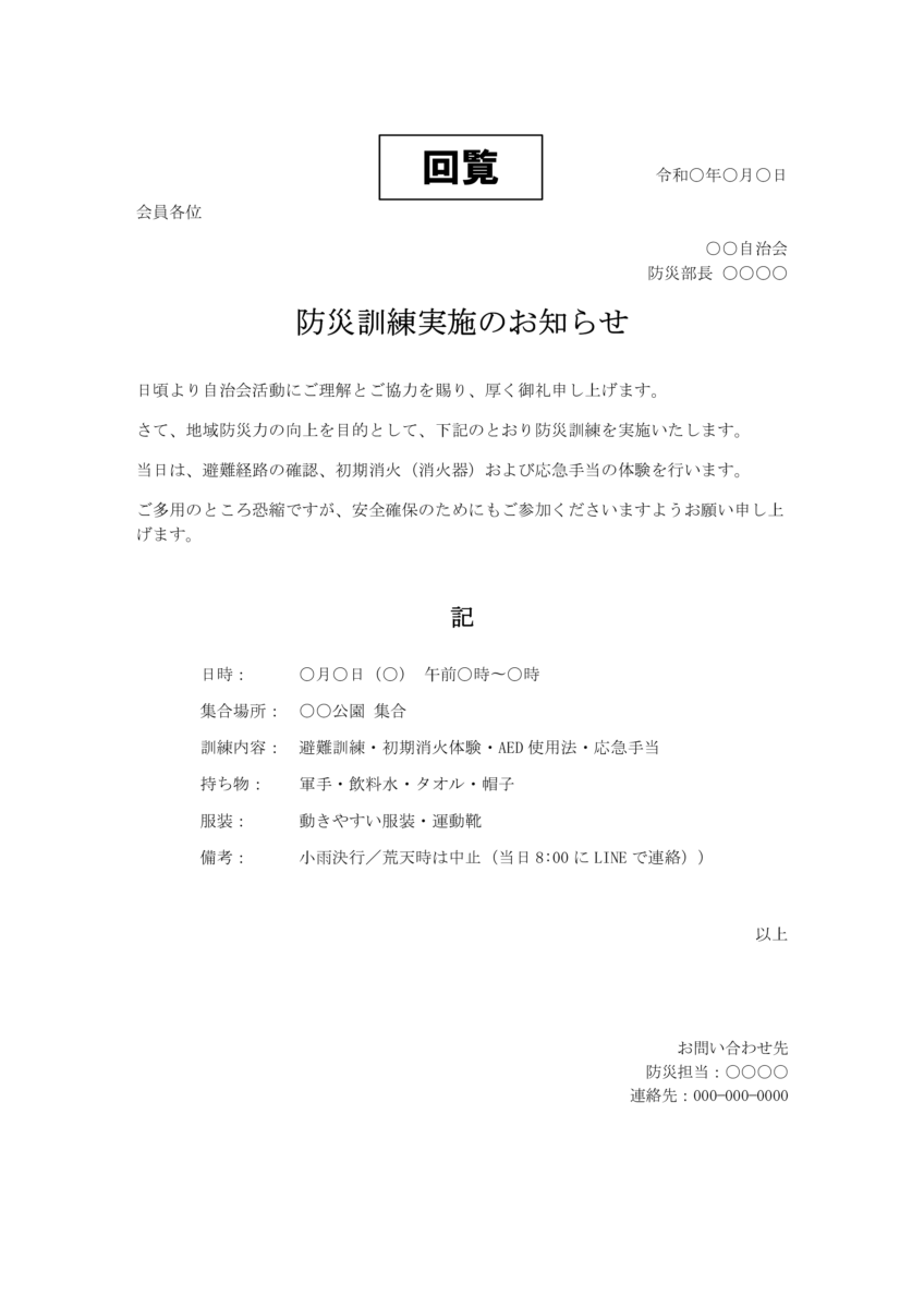- 必須項目の抜け防止:日時/集合場所(雨天時の扱い)/訓練内容/所要時間/持ち物(軍手・飲料・タオル・帽子・懐中電灯・笛)/服装(動きやすい靴)/連絡先