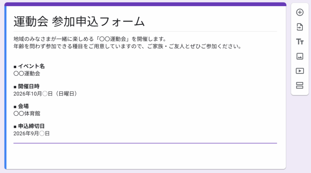 たとえば「運動会の参加申込フォームの項目を考えて」と入力すると、たたき台を作ってくれます。