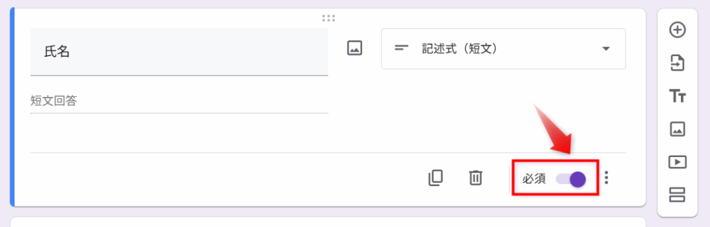 質問の右下にある「必須」をオンにすると、回答しないと送信できなくなります。