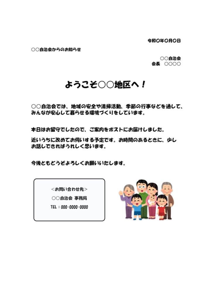そこで本記事では、訪問時にご不在だったお宅へポスト投函できる 自治会加入案内文テンプレート(Word形式) を、フォーマル・アピール・ポップの3タイプでご用意しました。後日訪問を前提とした案内構成と文体を重視し、読み手に自然に伝わることを第一としています。