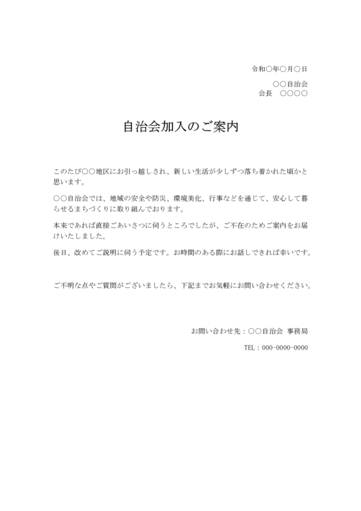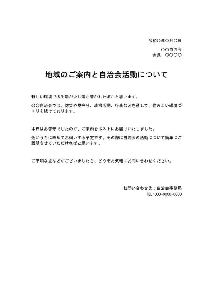 - 日付・自治会名・会長名を上部に記載すると安心感が出ます