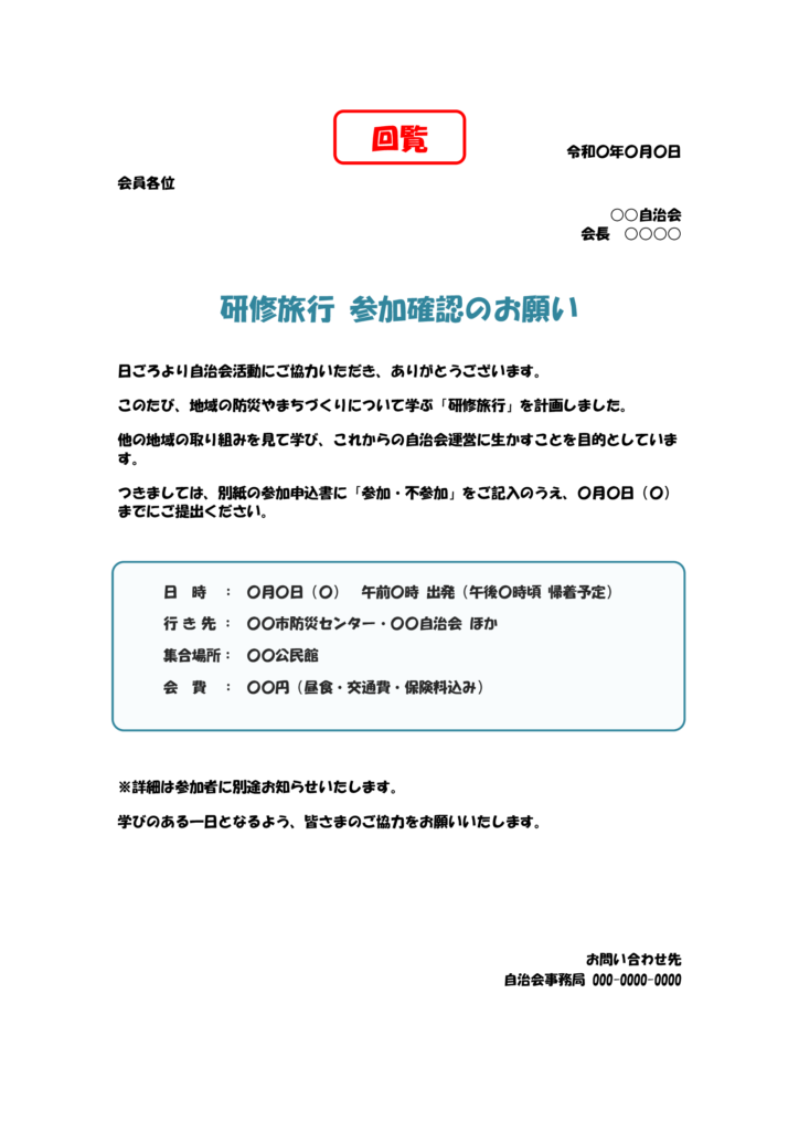 つきましては、別紙の参加申込書に「参加・不参加」をご記入のうえ、〇月〇日(〇)までにご提出ください。日時:〇月〇日(〇) 午前〇時 出発(午後〇時頃 帰着予定)