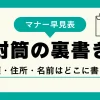 封筒の裏書きマナー早見表」で位置と書き方を図解しています。