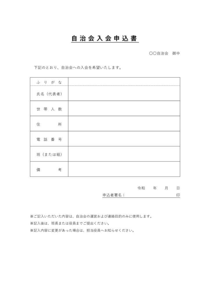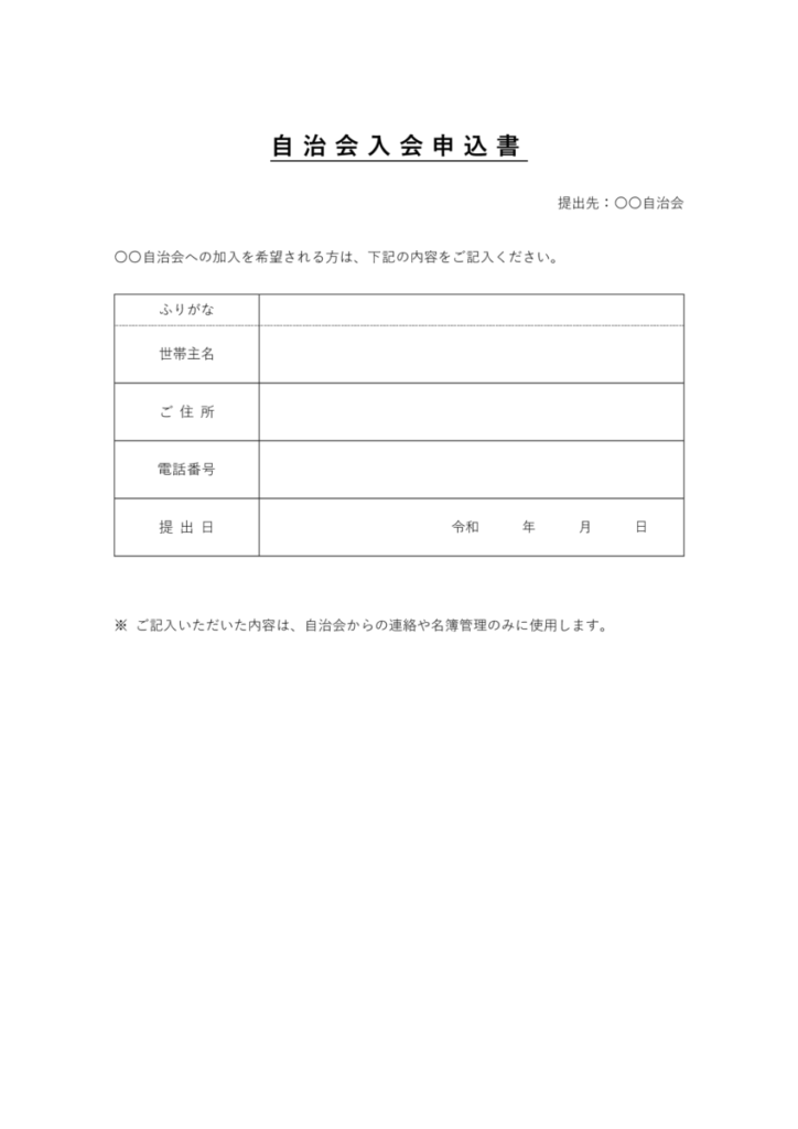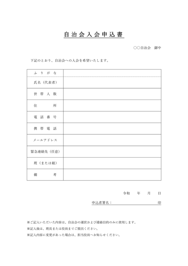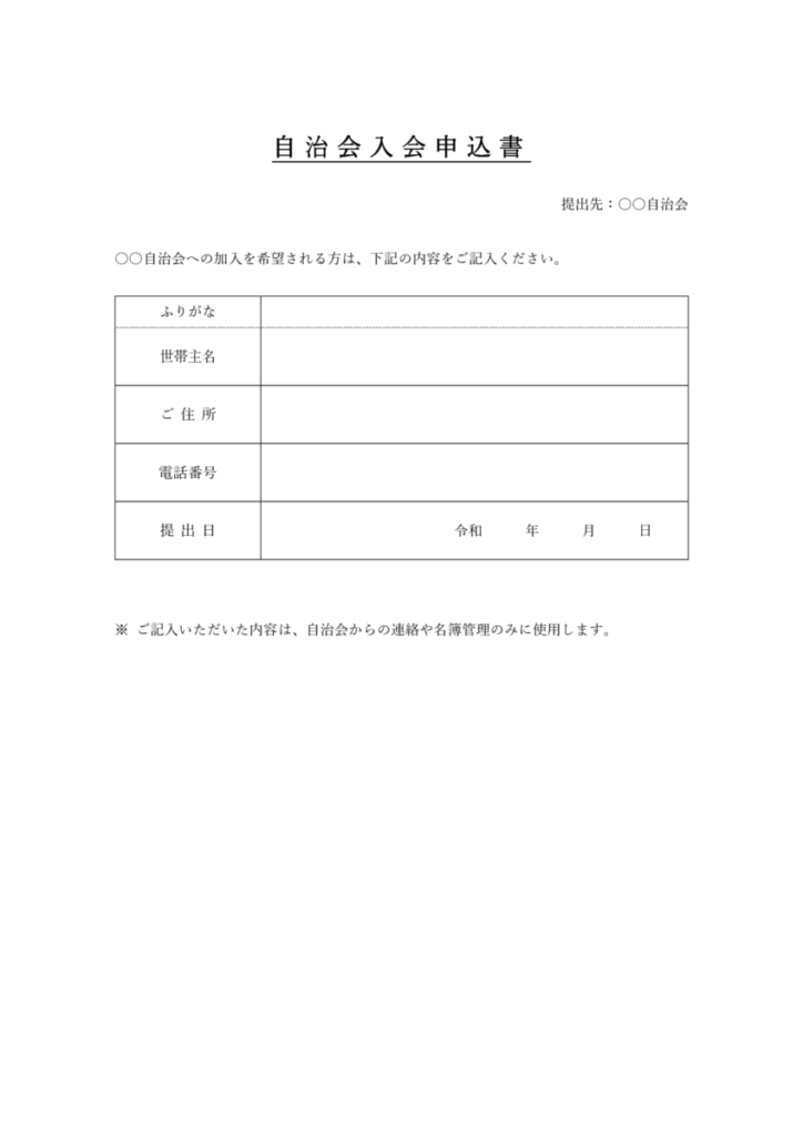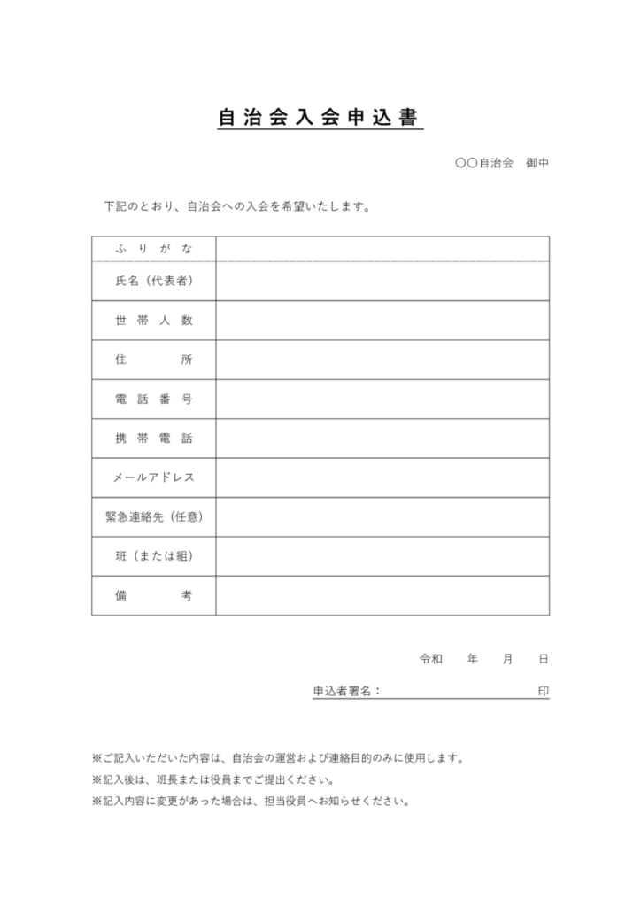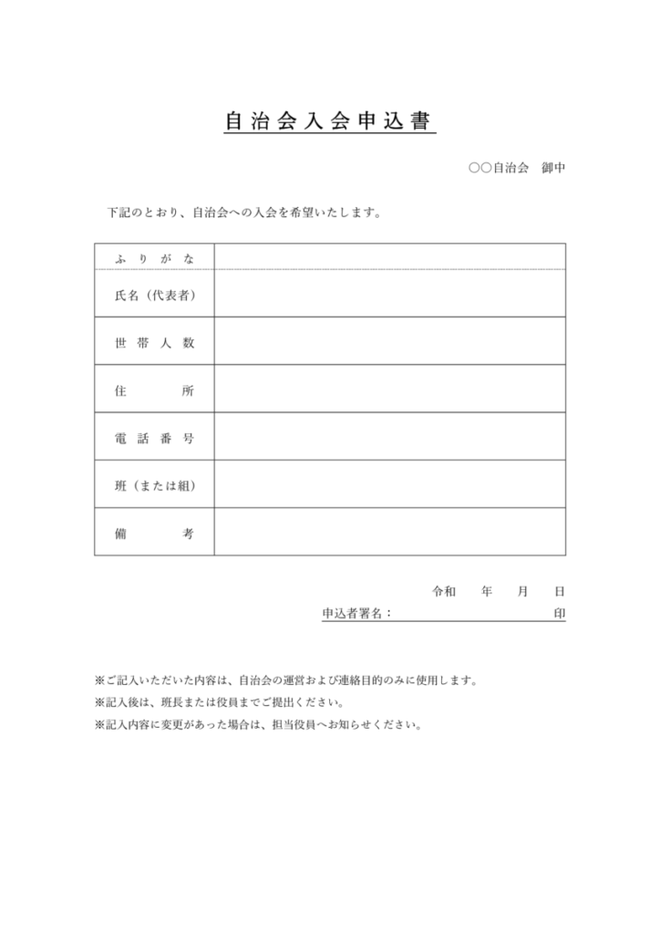 新しく自治会・町内会に加入する方に配布・提出してもらう「入会申込書」を、すぐに使える形でまとめました。